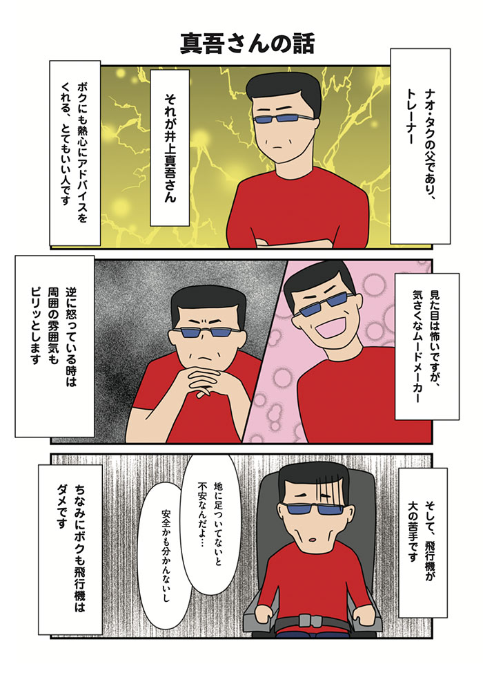 ナオヤ、タクマの父であり、作者コウキの叔父。自身もボクシングをやっていて、そのスタイルは気合いと根性で相手の心を砕くメンタルブレイカー。小さな頃から身体が大きかったコウキは幾度となく拳を交え、幾度となく心を砕かれる。高校生だったナオヤからダウンを奪った事もある。意地で放ったボディショットを、大人パンチと命名した。