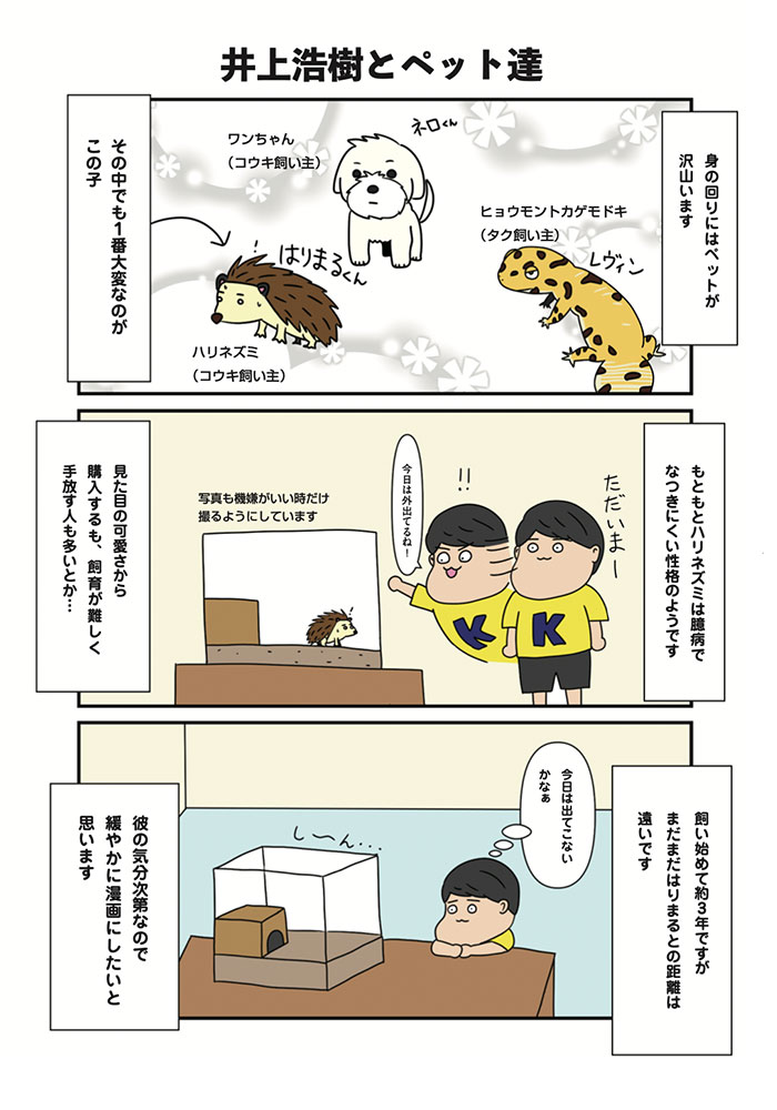マルチーズとペキニーズのミックス犬、ネロ▶名前の由来は飼い主のコウキが好きな声優さんが演じているキャラ名から頂いた。 ハリネズミのはりまる▶名前の由来は飼い主のコウキが好きな声優さんのあだ名とハリネズミのハリではりまるに。 ヒョウモントカゲモドキのレビン▶名前は飼い主のタクマがSNSで募集して決めた。